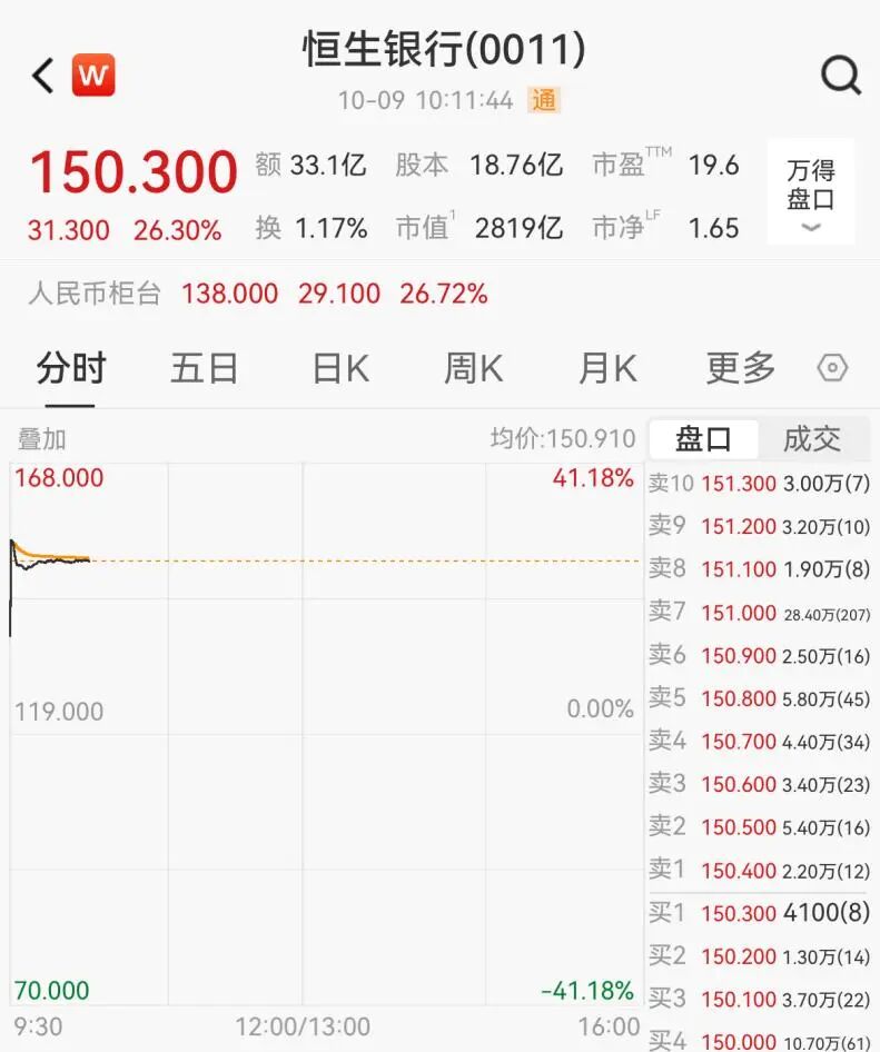 10月9日,港股恒生银行盘初一度飙涨41%。截至记者发稿,恒生银行涨26.3%,报150.3港元/股,最新市值为2819亿港元。