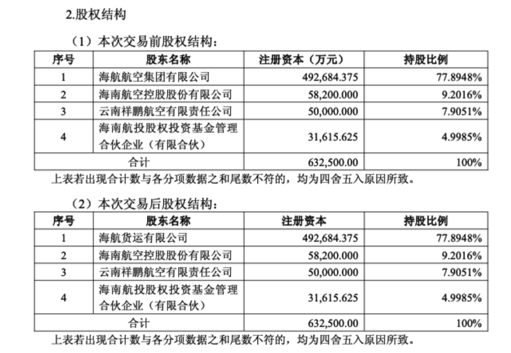公告指出,前述转让及增资交易完成后,海航航空集团将不再持有金鹏航空股权。本次交易完成后,海航货运、海航控股、祥鹏航空、海南航投将分别持有金鹏航空77.8948%、9.2016%、7.9051%、4.9985%的股权,海航控股及祥鹏航空对金鹏航空的持股比例不变。