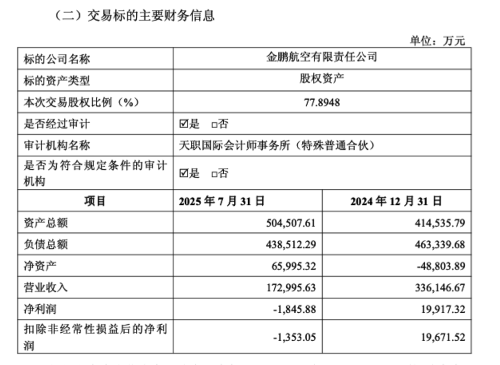 经营业绩方面,据前述公告介绍,截至今年7月底,金鹏航空实现营收17.3亿元,净利润-1845.88万元,净资产6.6亿元,负债总额达43.85亿元。2024年实现营收33.61亿元,实现净利润1.99亿元。据此前公告披露,金鹏航空2023年实现营收29.64亿元,净利润为-5.6亿元。
