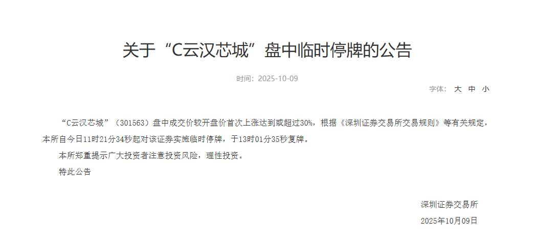 【C云汉芯城触发临停】深交所公告,“C云汉芯城”(301563)盘中成交价较开盘价首次上涨达到或超过30%,根据《深圳证券交易所交易规则》等有关规定,本所自今日11时21分34秒起对该证券实施临时停牌,于13时01分35秒复牌。(中新经纬APP)