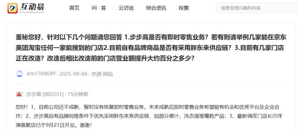【V观财报|步步高:暂时没有恢复即时零售业务】步步高10月9日在投资者互动平台回复提问表示,目前公司还不成熟,暂时没有恢复即时零售业务。未来成熟后即时零售业务希望能有机会和优秀平台及企业合作;步步高自有品牌同等条件下优先采用胖东来系供应链,如部分果汁,洗衣液等爆款产品;最新调改门店长沙洋湖荟聚店已于9月21日开业。(中新经纬APP)