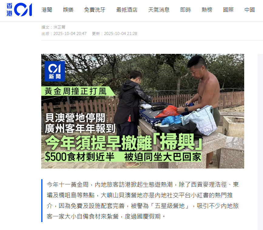 其中大屿山贝澳营地因免费又设施完善,被小红书博主奉为穷游圣地,不少内地家庭自备食材扎营,一度人满为患,直到台风“麦德姆”来袭,气象台挂起三号风球,营地才紧急清场。