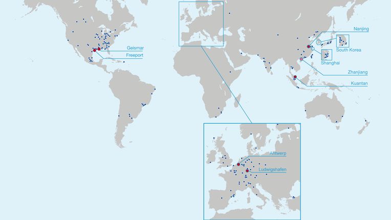 巴斯夫在德国、比利时、中国、马来西亚、美国共建有6个一体化基地。