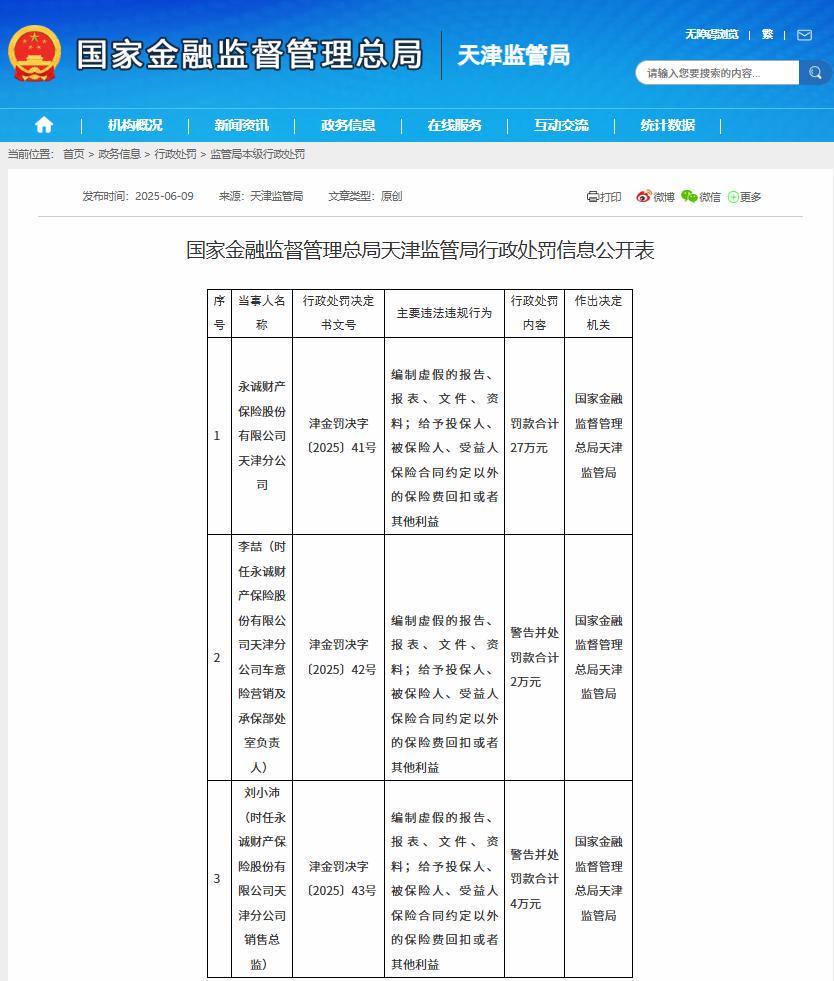 6月9日,天津监管局披露称,永诚财险天津分公司因存在“编制虚假的报告、报表、文件、资料;给予投保人、被保险人、受益人保险合同约定以外的保险费回扣或者其他利益”的违法违规行为,被罚款合计27万元。此外,对时任责任人李喆、刘小沛分别警告并处罚款2万元、4万元。