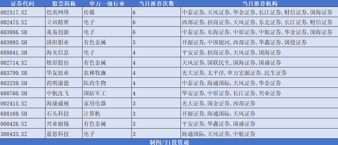 在统计的30余家券商10月金股中,恺英网络、立讯精密、兆易创新均获6次推荐,洛阳钼业被“点名次数”也达5次,海光信息、牧原股份、华友钴业、药明康德、中航沈飞等股也被多次提及。