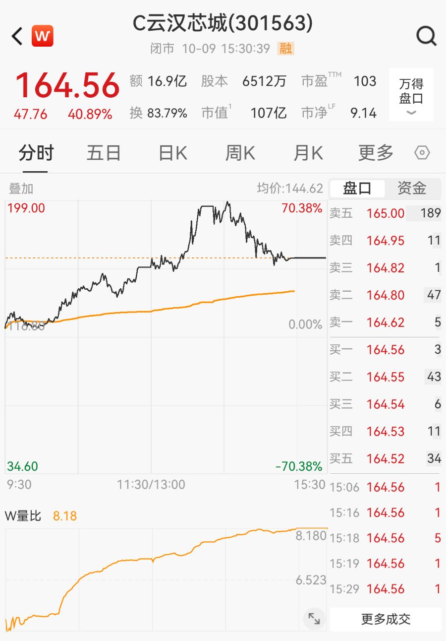 10月9日,次新股C云汉(云汉芯城,301563.SZ)再度成为市场焦点,盘中一度涨超70%,两次触发临停机制,截至收盘报164.56元/股,全日上涨40.89%。