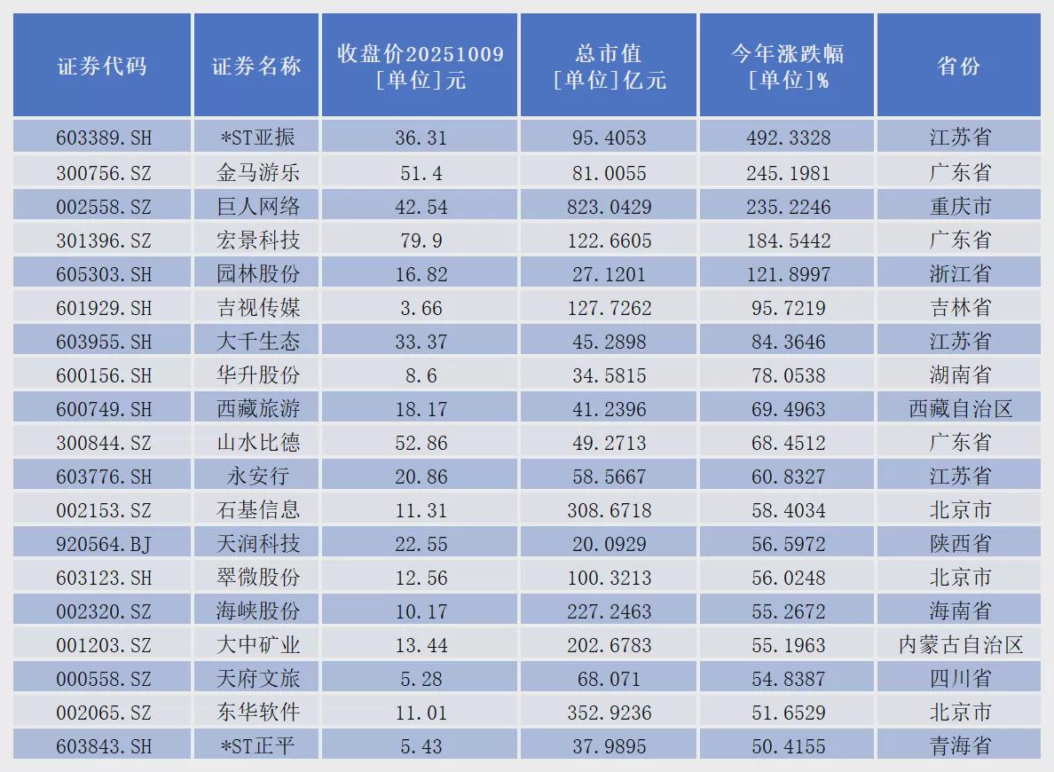 其中,*ST亚振(603389.SH)、金马游乐(300756.SZ)、巨人网络(002558.SZ)、宏景科技(301396.SZ)、园林股份(605303.SH)5家公司已经成功实现翻倍。