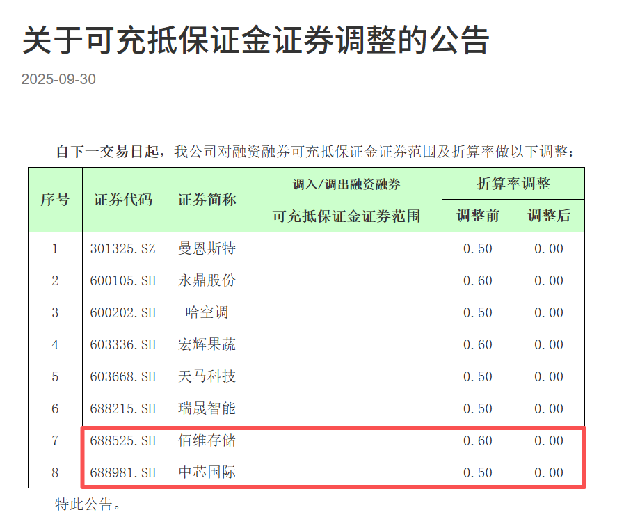 国信证券:9月30日发布两份可充抵保证金证券调整的公告,包括中芯国际、佰维存储在内,共计10家上市上市公司折算率调整为0,上述两只股票等为调整时间为自下一交易日起。另外6家分别为曼恩斯特、永鼎股份、哈空调、宏辉果蔬、富春染织、路桥信息,中芯国际的折算率由0.5调整为0.00,佰维存储的折算率由0.6调整为0.00。