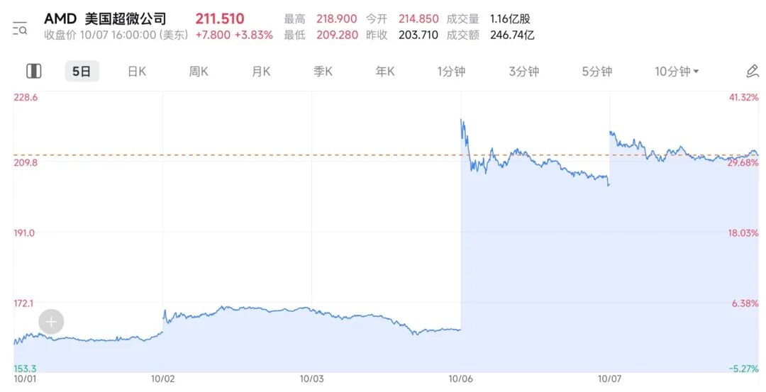 消息一出,资本市场瞬间沸腾,AMD的股价在当天交易中一度飙升超过34%,最终收涨23.71%,市值一日之内激增近800亿美元,创下九年多来的最大单日涨幅。