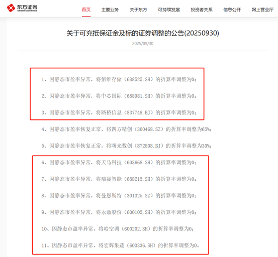 券商中国记者注意到,除了东方财富证券,东方证券和国融证券也在9月30日官网发布了类似的公告,因静态市盈率异常,将中芯国际、佰维存储、天马科技、瑞晟智能科技、曼恩斯特、宏辉果蔬、永鼎股份、路桥信息、哈空调的折算率均调整为0,上述调整自10月9日正式生效。