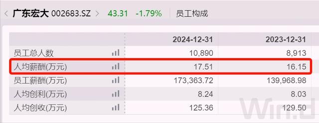 至2024年末,广东宏大职工总数大约1.09万人,比2023年增加近两千人;去年该公司人均创利8.2万元,人均税前薪酬17.5万元,比2023年增加1.4万元。