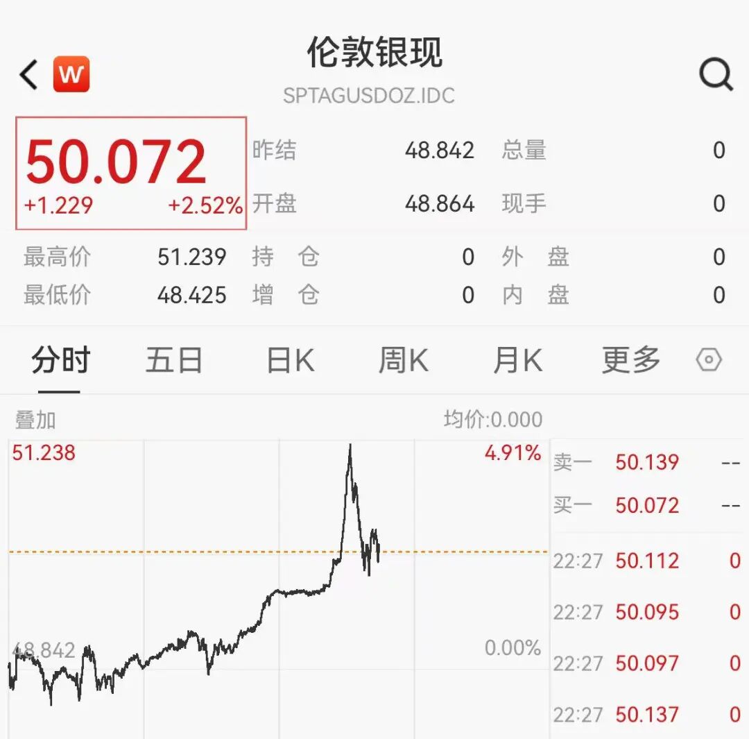 10月9日晚间,现货白银历史首次升至50美元/盎司关口上方,随后一度涨破51美元关口,年内累计涨逾73%,表现优于黄金。