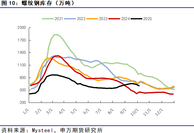 铁矿石:海外发运量高位波动(9月周均3337万吨),国产矿稳中偏弱。11月西芒杜矿山发货预期增强供应压力。钢厂补库接近尾声,铁水产量高位但进一步增长乏力。港口库存低位回升(47港库存14551万吨),节后累库预期强化。10月中上旬因补库需求减弱、供应宽松,价格可能下探;下旬关注宏观政策预期,或触底反弹。