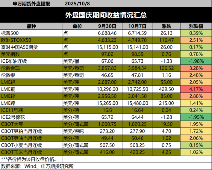 国外宏观:国庆长假期间, 美国 9 月 ADP 就业、服务业 PMI 弱于市场预期。 9 月 ADP 就业减少 3.2 万人,大幅低于市场预期的新增 5.1 万人,年度基准调整对其构成了 4.3 万人的影响,但就业市场趋势仍为走弱;美国 9 月 ISM 服务业 PMI 回落至 50 ,其中商业活动、新订单指数分别回落至 49.9 、 50.4。贵金属:国庆期间黄金持续创历史新高并突破4000美元/盎司,整体上黄金正处于一个历史级别的长期牛之中,核心驱动包括对美国债务可持续性的担忧下,对美元货币体系的风险对冲需求、各国央行的外汇储备需求,黄金作为一般等价物价值的回归。原油:节日期间,国际油价先跌后涨,整体价格基本与节前持平。 因供给端持续增产、需求不足、降息速度缓慢、地缘风险烈度可控等因素,持 震荡偏空观点。