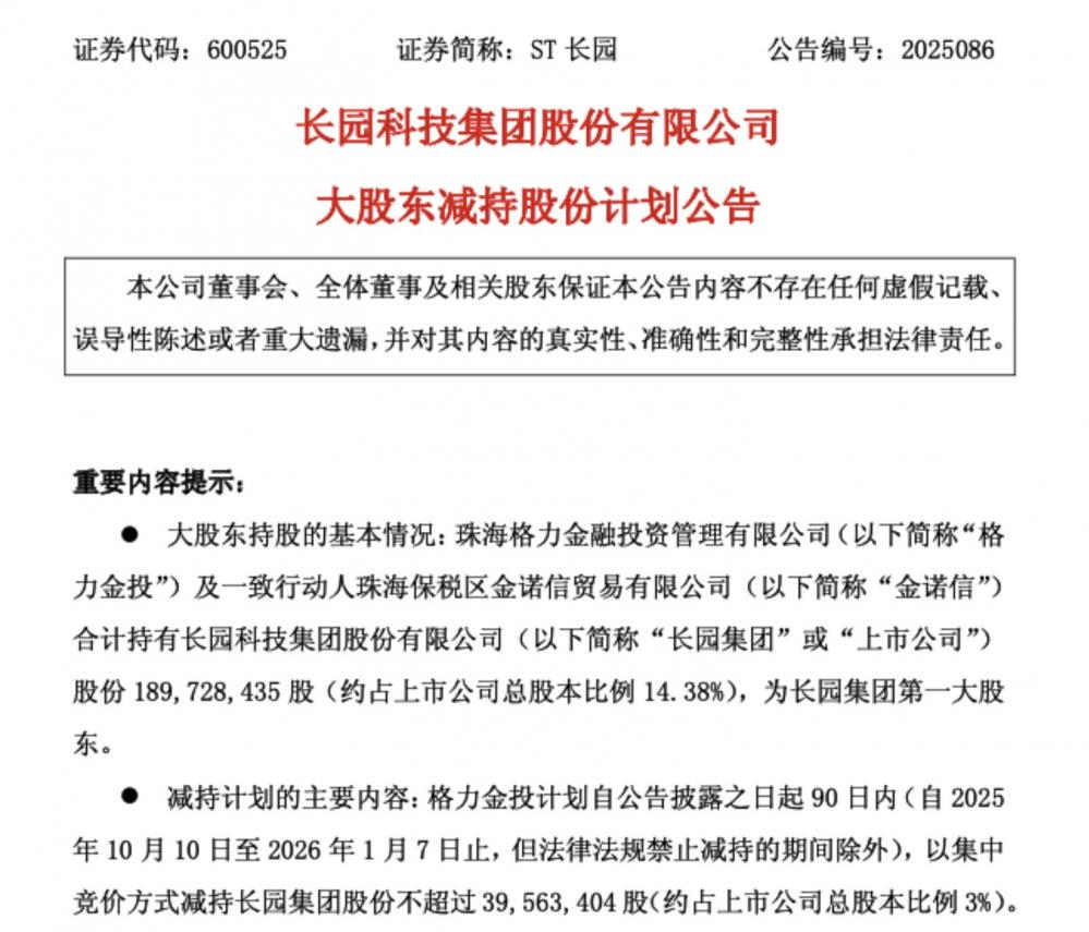 10月9日晚,ST长园(600525.SH)一纸大股东减持公告,再度将这家深陷治理争议的上市公司推上风口浪尖。