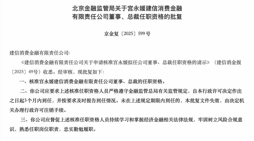 国庆节前,国家金融监督管理总局北京监管局网站发布了一则批复,该局核准宫永媛建信消金董事、总裁的任职资格。