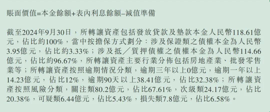 彼时的公告还提及,上述转让资产主要行业分布包括房地产业、批发零售业等;逾期三年以上0亿元,逾期一年以上14.23亿元,占比12%,逾期90天以上38.41亿元,占比32.38%;按照风险分类,关注类80.2亿元,占比67.61%,次级类24.17亿元,占比20.38%,可疑类6.44亿元,占比5.43%,损失类7.8亿元,占比6.58%。