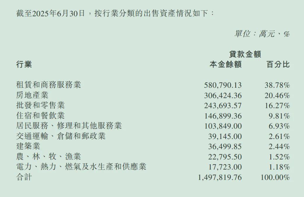 按行业分类,上述149.78亿元的贷款本金中,租赁和商务服务业最多,余额58.08亿元,占比达到38.78%,其次是房地产业、批发和零售业、住宿和餐饮业及居民服务、修理和其他服务业,余额均超过10亿元,分别为30.64亿元、24.37亿元、14.69亿元、10.38亿元,占比分别为20.46%、16.27%、9.81%、6.93%。