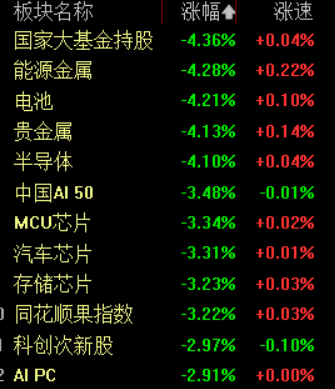 09:40创业板指下挫跌2%,沪指跌0.52%,深成指跌1.20%。贵金属、半导体芯片、有色金属等方向跌幅居前,市场下跌个股超2300只。
