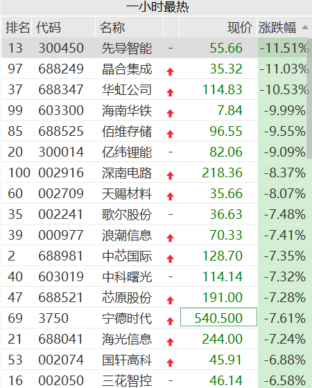 芯片股同步下挫,华虹公司、东芯股份跌超10%,中芯国际跌逾7%,寒武纪跌近5%。