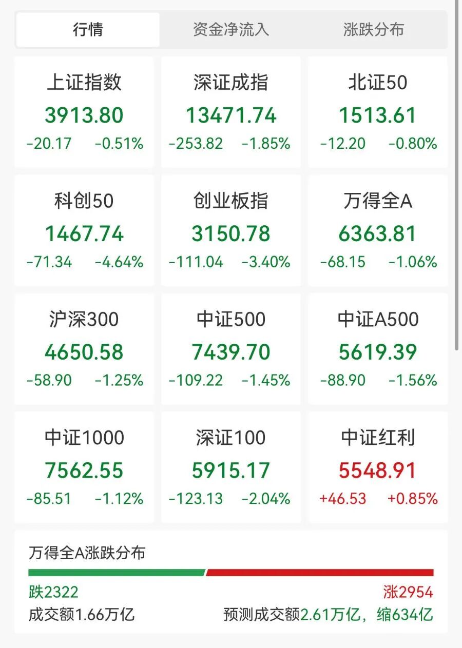 10月10日,三大指数集体低开,截至午盘,上证指数跌0.51%,深证成指跌1.85%,创业板指跌3.4%。市场超2300家个股下跌,成交额1.66万亿,预计成交额上一交易日同期缩量634亿元。
