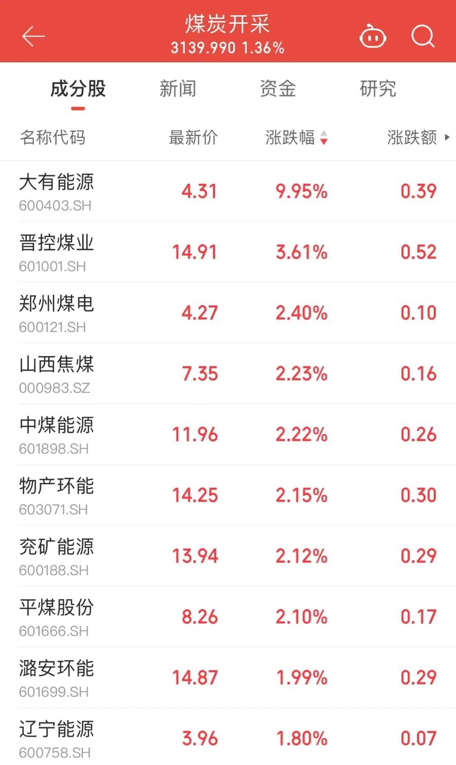 煤炭开采加工板块震荡上扬,大有能源涨停,晋控煤业、山西焦煤、郑州煤电、潞安环能跟涨。