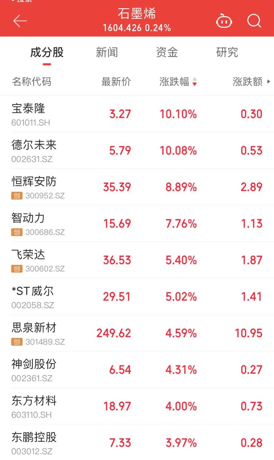10月10日,石墨烯概念逆市活跃,宝泰隆、德尔未来涨停,恒辉安防、飞荣达、东方材料等跟涨。消息面上,商务部、海关总署发布公告,公布对锂电池和人造石墨负极材料相关物项实施出口管制的决定。