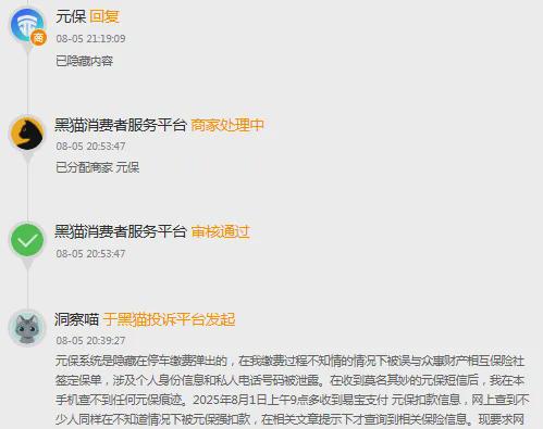 以今年8月的一个投诉为例,该受害人提到“元保植入停车缴费软件广告”,即元保系统是隐藏在停车缴费弹出的,在缴费过程不知情的情况下被误与众惠财产相互保险社签定保单,涉个人身份信息和私人电话号码被泄露。在收到莫名其妙的元保短信后,其手机查不到任何元保痕迹,不久收到易宝支付元保扣款信息。
