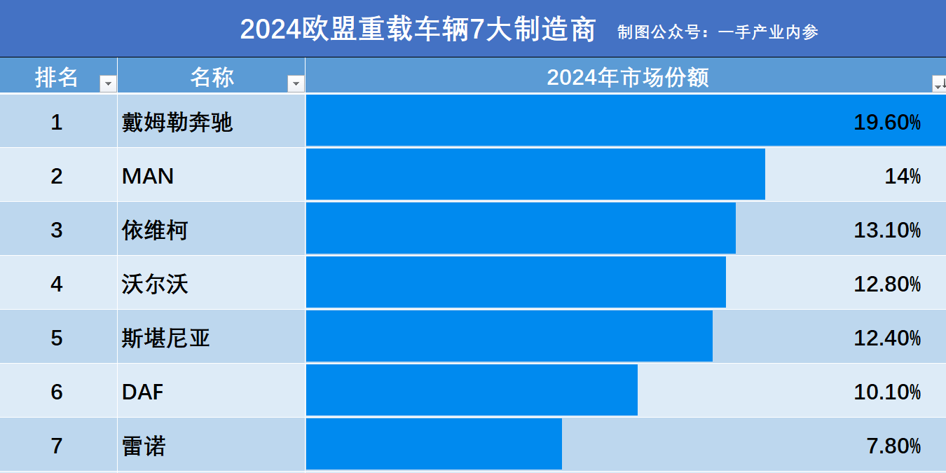 欧洲市场销量第1位的重载车辆品牌,是来自德国的戴姆勒(奔驰卡车),悬挂“三叉星徽”商标。2024年戴姆勒重载车辆在欧盟市场占比为19.6%,同比下滑了1.4个百分点。戴姆勒集团国内与北汽集团,也有福田戴姆勒的合资公司。