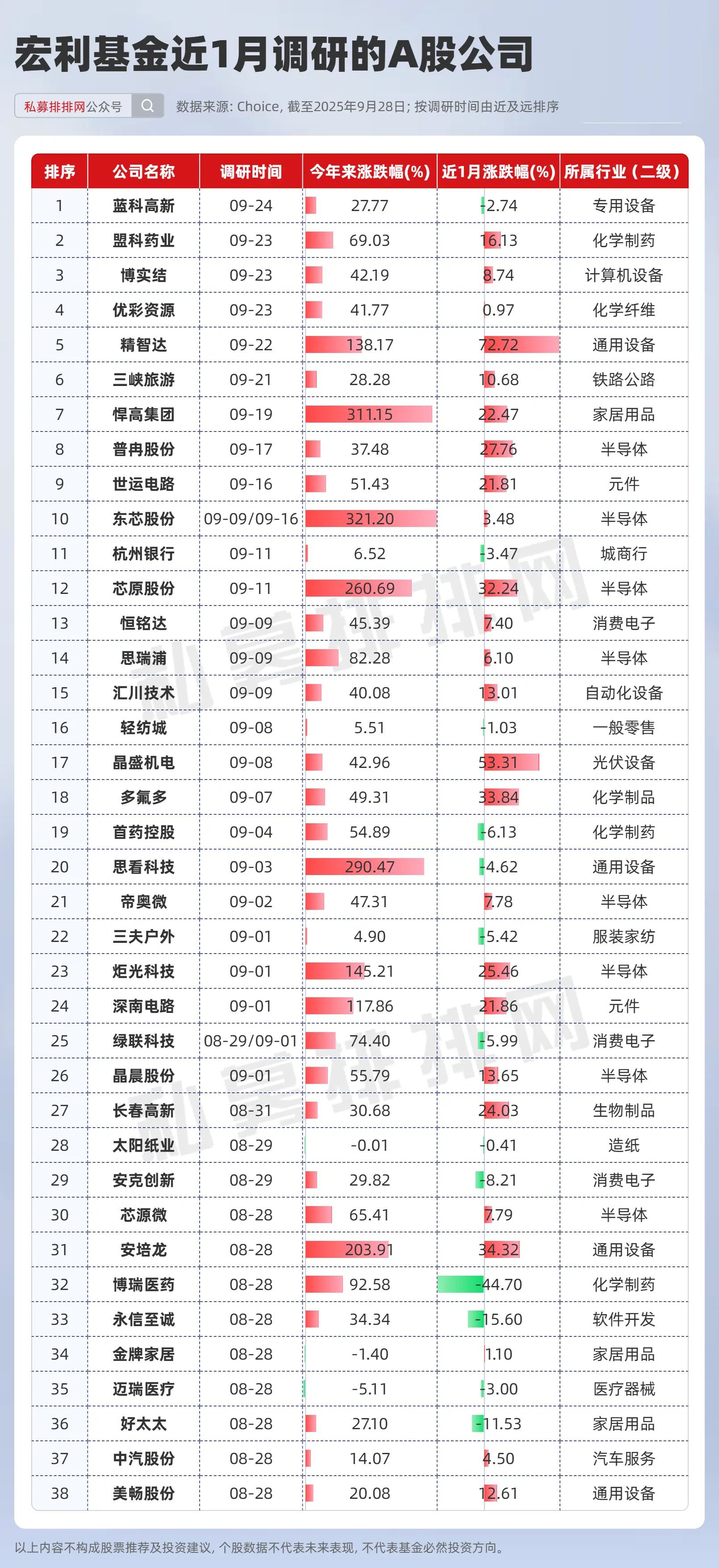 宏利基金近1个月共调研38家公司,其中东芯股份等2家公司被调研了两次。从年内涨幅来看,实现上涨的公司共有35家,其中涨幅超过40%的公司共有16家,股价实现翻倍的公司共有8家。从所属行业来看,半导体、通用设备板块的公司较多,分别有8家、4家。