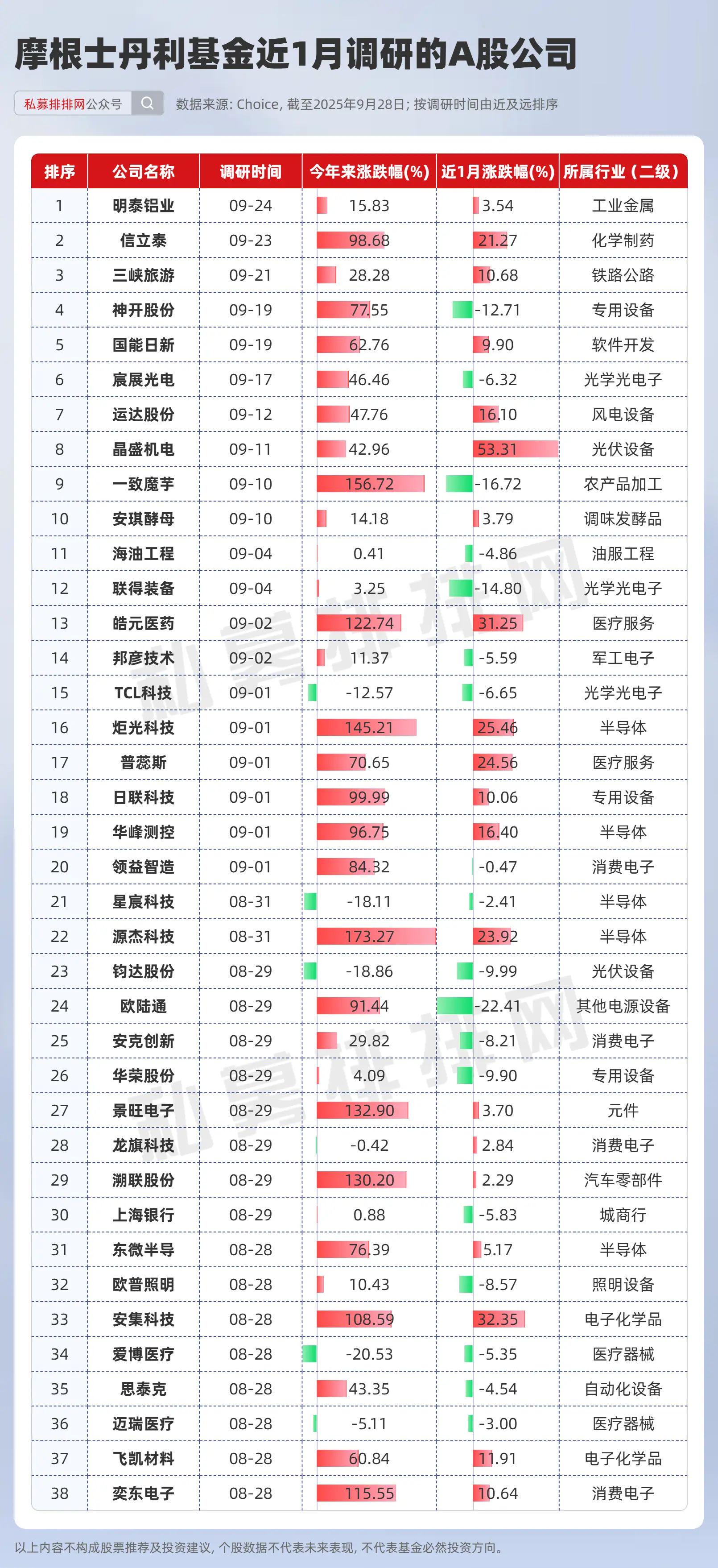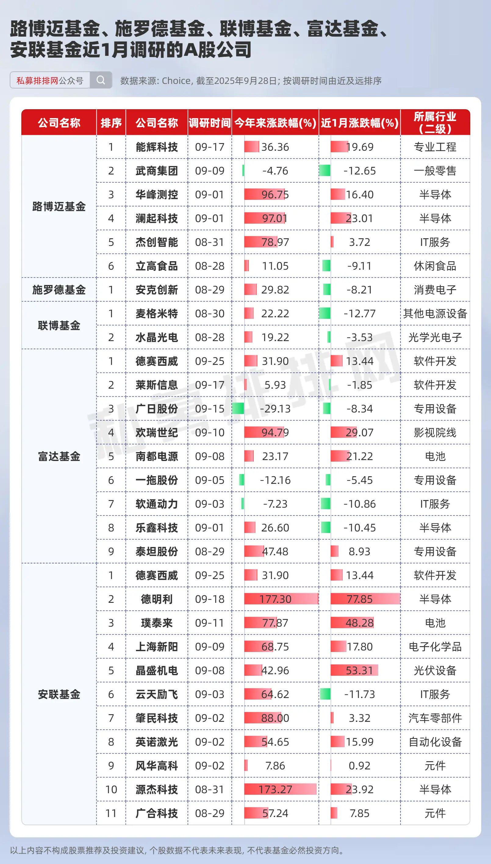 从公募机构对A股市场的布局来看,路博迈基金、富达基金、摩根基金等机构新发行基金超过30只。另外,摩根基金、摩根士丹利基金、宏利基金近1月对A股公司的调研均接近40只。那么,近1个月,这些知名外资公募都布局了哪些A股公司呢?(注:本文数据来源于Choice,截至2025年9月28日)