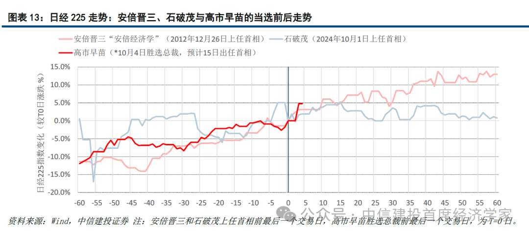 展望十月及四季度,如高市重拾“安倍经济学”,则日股将受到更强的流动性支撑。在2012年12月26日,安倍晋三开启其第二个首相任期,在政策端引入“安倍经济学”,如图表13所示,“安倍经济学”前后的日本股市整体以小幅上行为主,虽然其经济的复苏仍然缓慢,但流动性的充裕将支撑股市。