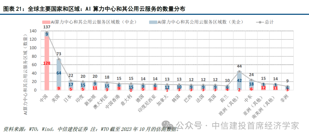 展望十月及四季度,我国和美国将继续领先和受益于AI产业建设。如图表21,根据WTO测算,中国和美国,是全球最领先的AI算力中心及其公用云服务集中区域;同时,中国和美国企业,也为全球提供了最主要的AI算力中心及其公用云服务;WTO强调,考虑私有AI算力中心的昂贵等因素,AI算力中心及其公用云服务,将是地区AI产业和后续AI生态成长的最重要基础设施之一。AI产业仍将引领中国相关科技产业快速发展,并将继续带动A股港股科技板块上涨。