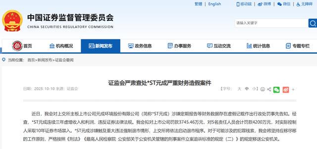 新京报讯 据证监会网站消息,近日,证监会对上交所主板上市公司元成环境股份有限公司(简称*ST元成)涉嫌定期报告等财务数据存在虚假记载作出行政处罚事先告知。经查,*ST元成连续三年虚增收入和利润,违反证券法律法规。证监会拟对上市公司罚款3745.46万元,对5名责任人员合计罚款4200万元,对实际控制人采取10年证券市场禁入。*ST元成涉嫌触及重大违法强制退市情形,上交所将依法启动退市程序。对于可能涉及的犯罪线索,证监会将坚持应移尽移的工作原则,严格按照《刑法》《最高人民检察院 公安部关于公安机关管辖的刑事案件立案追诉标准的规定(二)》的规定移送公安机关。