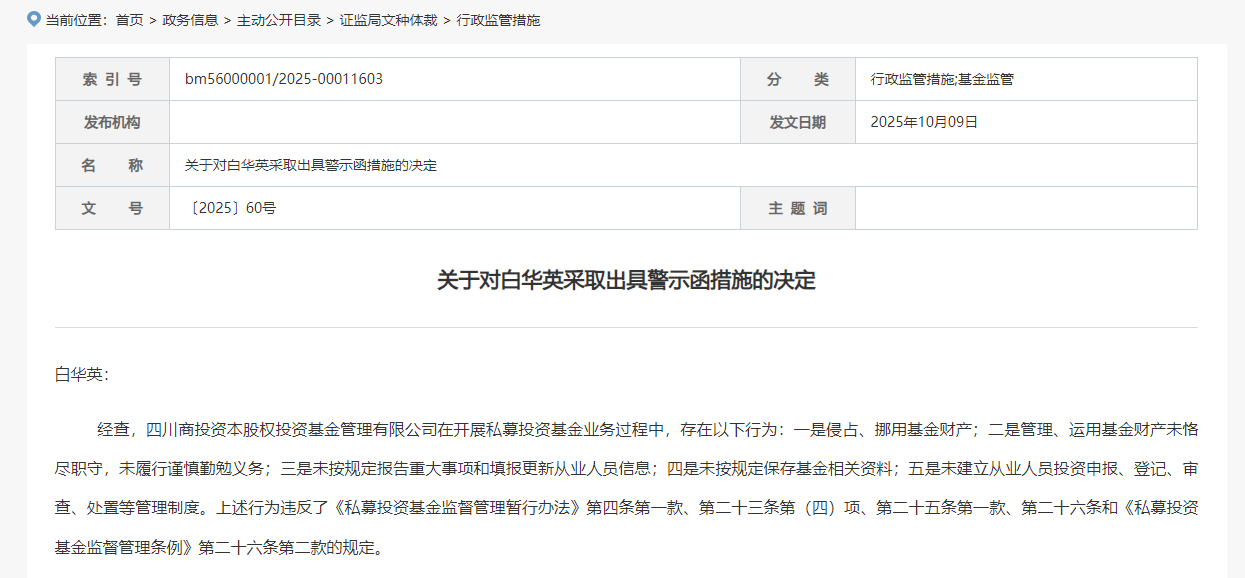 微成都报道10月9日,四川证监局发布公告表示,因侵占、挪用基金财产等五宗违规,对四川商投资本股权投资基金管理有限公司(简称“四川商投资本”)采取责令改正的措施,并对该公司董事长白华英采取出具警示函的措施。