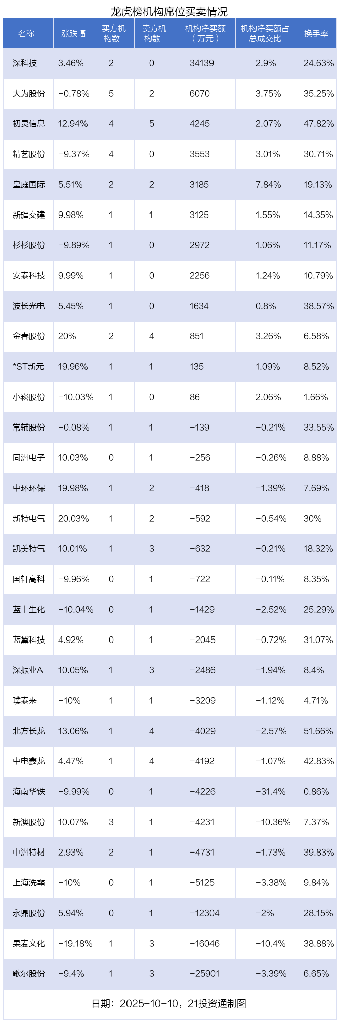 其中,机构净买入金额最多的是深科技(000021.SZ),当日收盘上涨3.46%,换手率为24.63%。