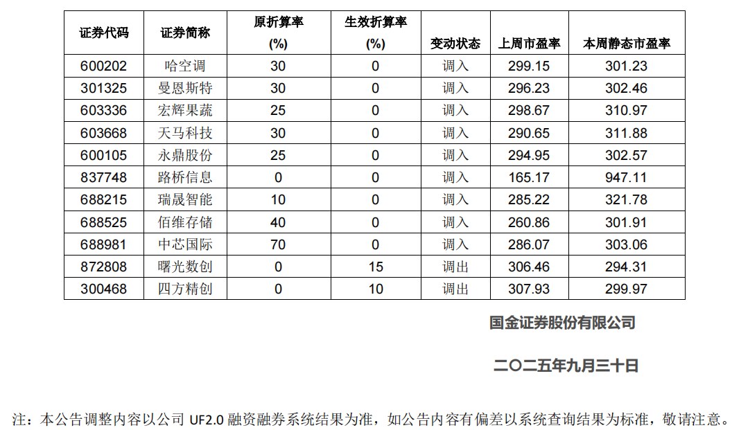 而且,多家券商的操作节奏高度一致。国金证券在9月30日公告称,由于佰维存储和中芯国际静态市盈率分别为301.91倍和303.06倍,其两融折算率由40%和70%降至0。