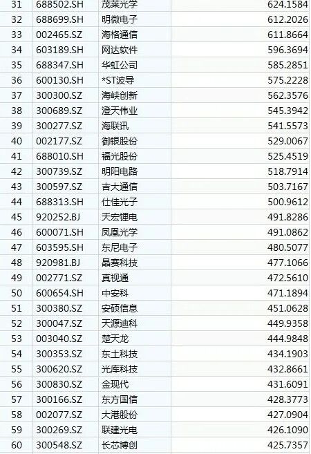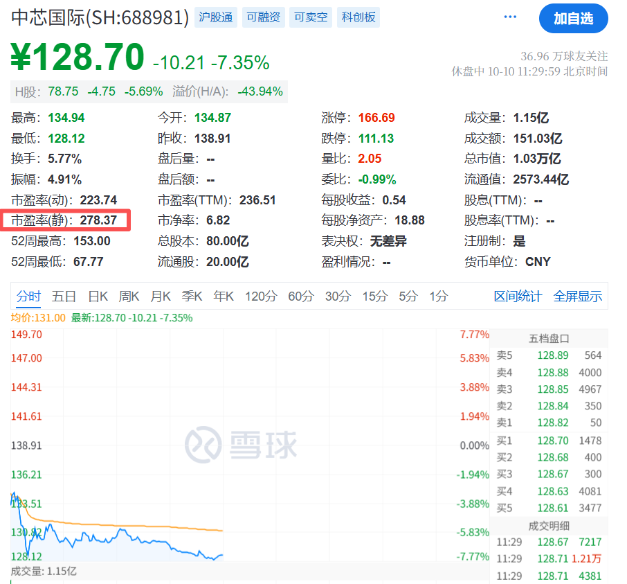 大名鼎鼎的中芯国际,静态市盈率刚好触及300倍红线,为300.45倍。
