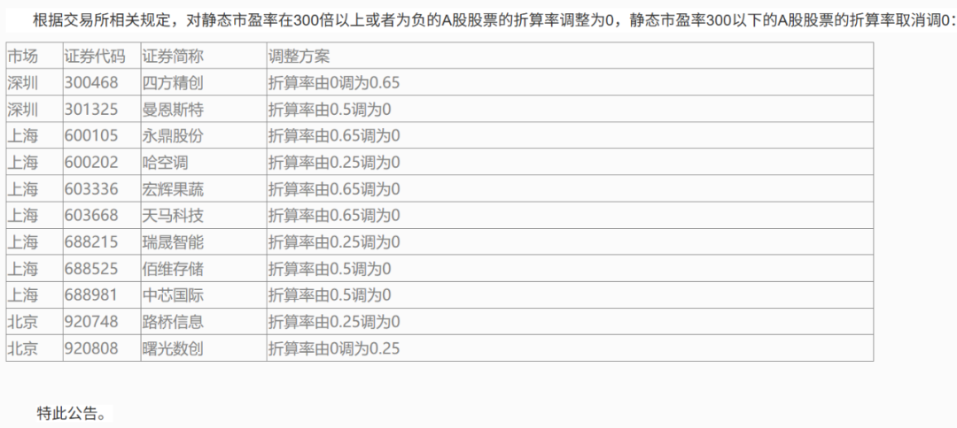中信建投证券则在10月9日公告,依据交易所规定,将市盈率超300倍或为负的A股股票折算率统一调整为0,其中亦包括上述两只股票。