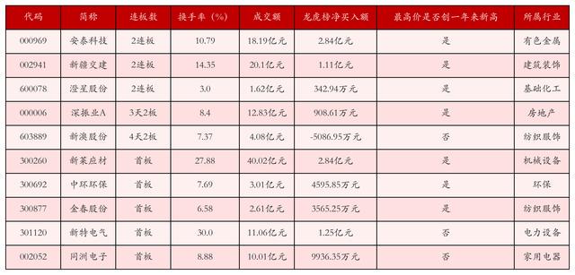 截至10月10日收盘,上证综指下跌0.94%,收于3897.03点,深证成指下跌2.7%,收于13355.42点,创业板指下跌4.55%,收于3113.26点。今日沪深两市A股共计72只涨停,综合当前连板数以及当日龙虎榜数据,其中较为强势的前三只个股分别为:安泰科技(000969)、新疆交建(002941)与澄星股份(600078)。今日强势个股前10位具体数据见下表: