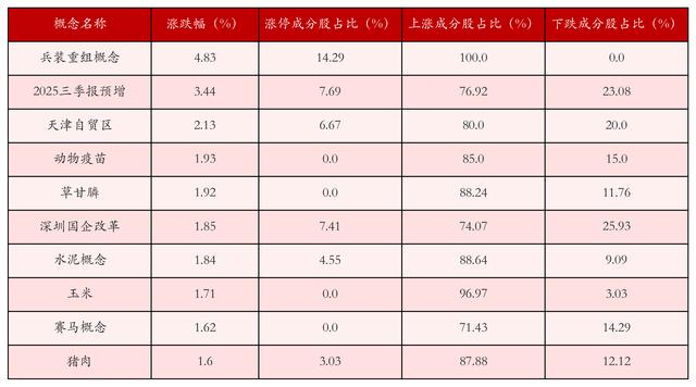 根据A股概念涨跌幅与所对应的股票池综合分析,涨幅靠前的三个概念板块分别为:兵装重组概念、2025三季报预增与天津自贸区。排名前10位的概念板块相关数据见下表: