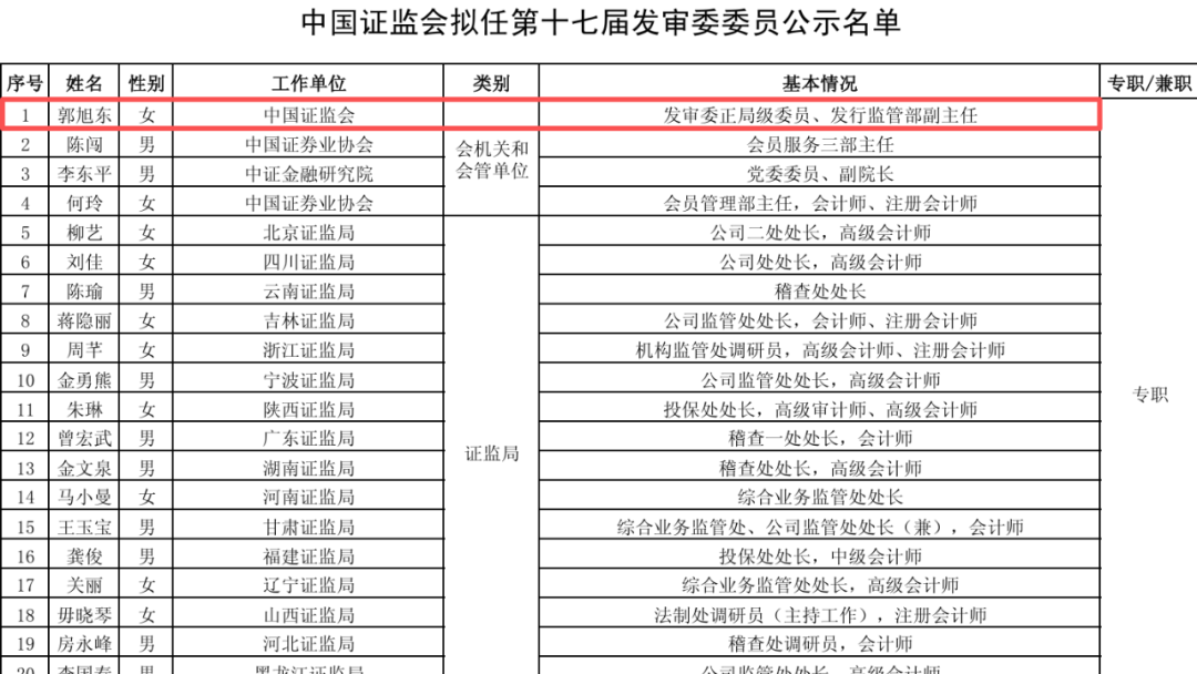 2007年5月,郭旭东首次以兼职委员身份出现在第九届发审委名单中。当年25名委员中,她是唯一一位来自监管系统的女性委员。