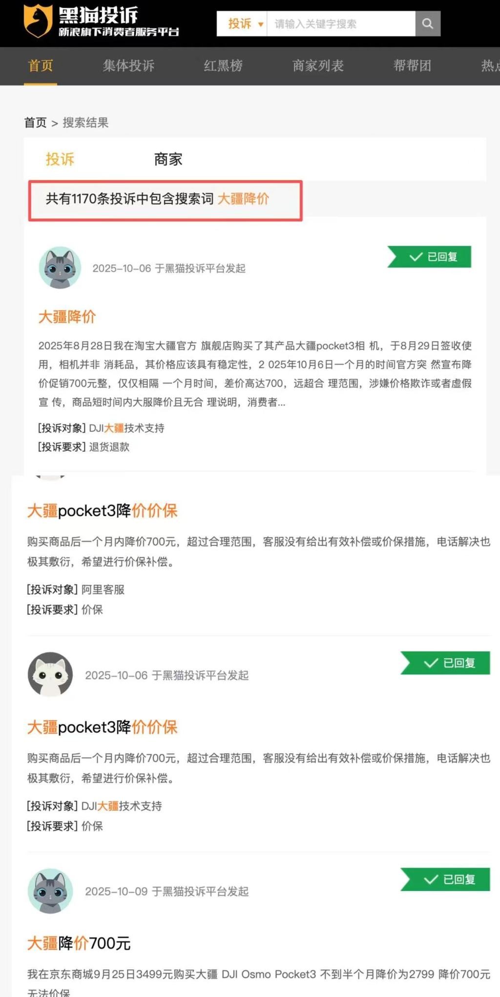 在黑猫投诉平台上搜索关键词“大疆降价”,目前已有1170条相关投诉
