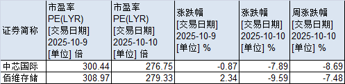 Wind数据显示,本周两个交易日,中芯国际、佰维存储分别累计下跌8.69%、7.48%,这些股票的静态市盈率随着股价调整而有所下降。截至10月10日收盘,中芯国际、佰维存储静态市盈率分别为276.75倍、279.33倍。而截至10月9日收盘,中芯国际的市盈率为300.44倍,佰维存储的市盈率为308.97倍。