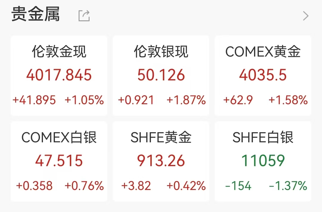 国际贵金属期货普遍收涨,COMEX黄金期货涨1.58%报4035.50美元/盎司,伦敦金现涨1.05%,报价双双再次来到4000点。COMEX白银期货涨0.76%。