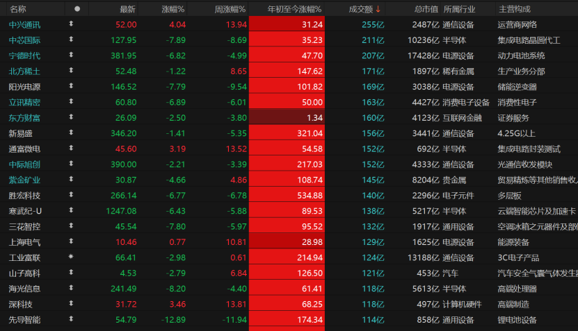 具体个股来看,中芯国际收跌7.89%报127.95元/股,宁德时代收跌6.82%报381.95元/股,立讯精密收跌6.89%报60.8元/股,紫金矿业收跌4.66%报30.87元/股,胜宏科技收跌6.77%报266.14元/股。