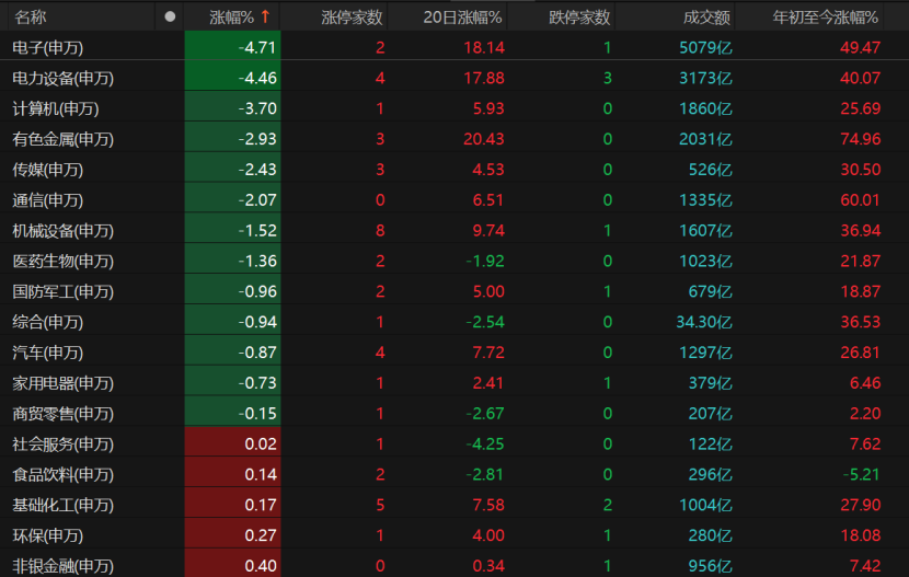 电子、电力设备、计算机、有色金属、传媒、通信、机械设备、医药生物等板块领跌。个股方面,寒武纪-U收跌6.43%报1247.08元/股,海光信息跌幅超过8%;阳光电源跌近8%,亿纬锂能跌近11%;当虹科技跌幅超过11%,浪潮信息、虹软科技跌幅均超过8%;紫金矿业跌近5%;国盾量子收跌9.72%,中天科技、润泽科技、世嘉科技跌幅均超过7%。