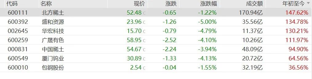 截至10月10日A股收盘,包钢股份、北方稀土分别跌1.55%、1.22%。另据wind,A股稀土指数年内涨幅超100%,其中北方稀土、盛和资源、华宏科技、广晟有色四只概念股年内涨幅已经翻倍。