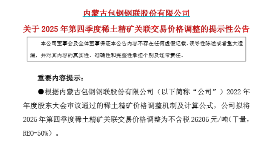 公告均称,拟将2025年第四季度稀土精矿关联交易价格调整为不含税26205元/吨(干量,REO=50%)。REO每增减1%,不含税价格增减524.10元/吨。