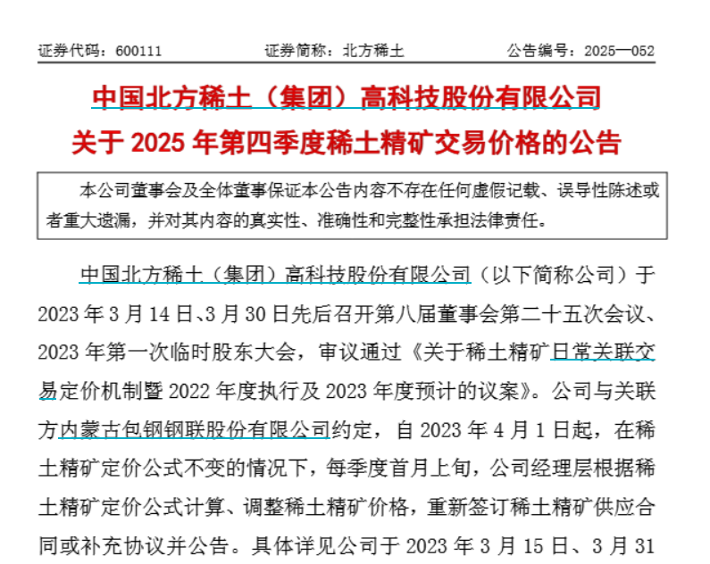 10月10日晚间,包钢股份、北方稀土发布公告,上调2025年第四季度稀土精矿关联交易价格。